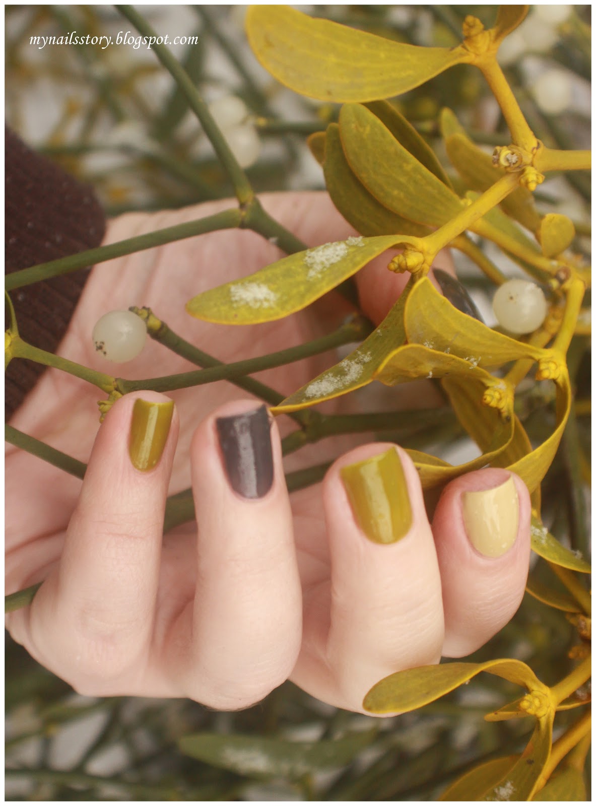 Многоцветный маникюр: China Glaze Budding Romance, Kalahari Kiss, Contrary Polish Creeping Moss